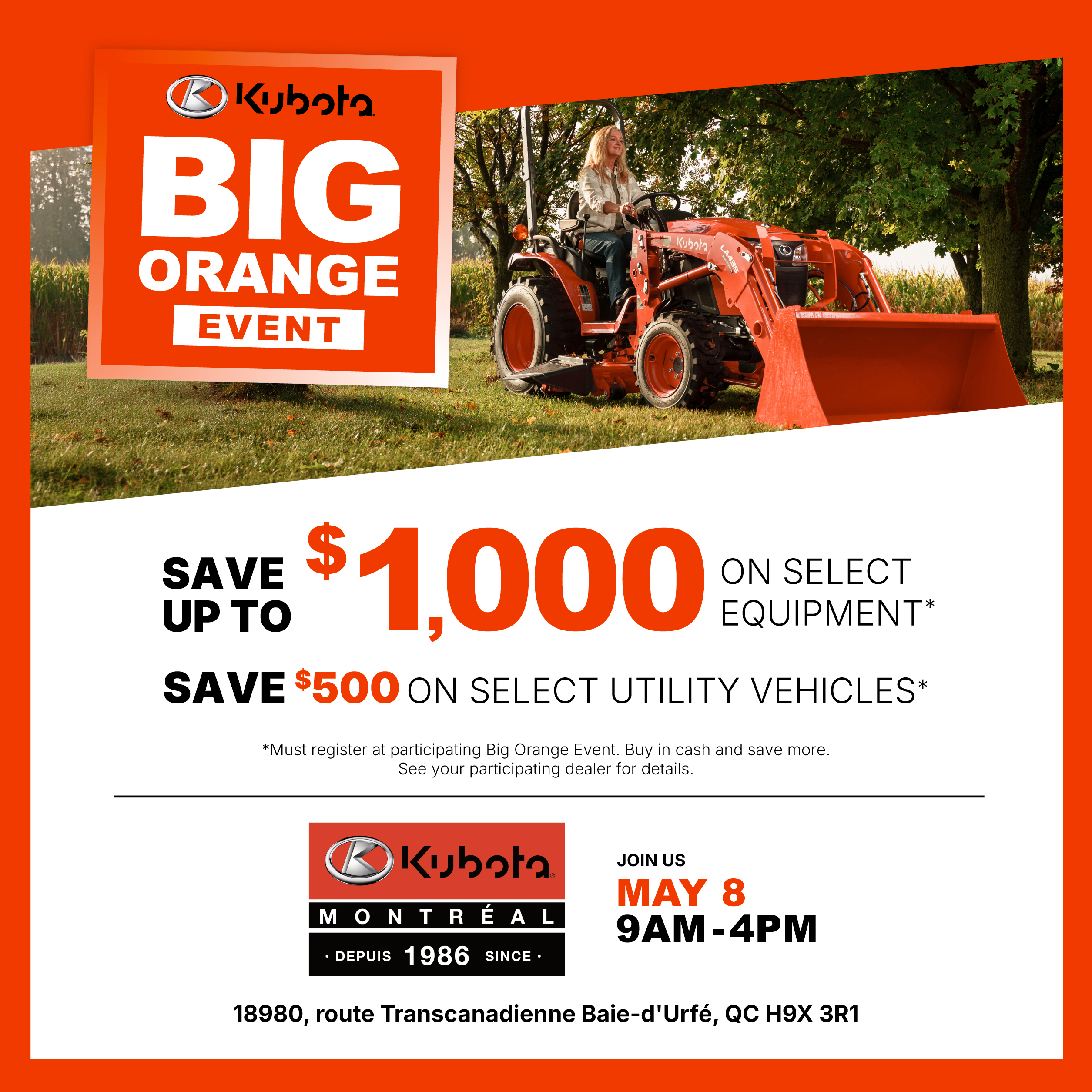 Valid at participating Kubota dealers in Canada. Discount valid on purchase of new equipment only as marked. To receive the discount coupon, customer must register at the participating Kubota Canada dealer between April 1st to June 30th, 2026. Coupon cannot be used in combination with other coupons or any other special discount (i.e. government, multiple, on-line, price fighter discounts, special client, direct mailer or policy type discounts). Coupon value will be deducted before taxes. Coupon: (i) cannot be applied to past transactions; (ii) has no cash surrender or other value; and (iii) expires after 30 days. Customer will have 30 days to redeem the discount on the applicable new equipment purchase. Some conditions apply, please see your participating Kubota dealership for more details. National promotions and the Big Orange Event can be combined on equipment as indicated.